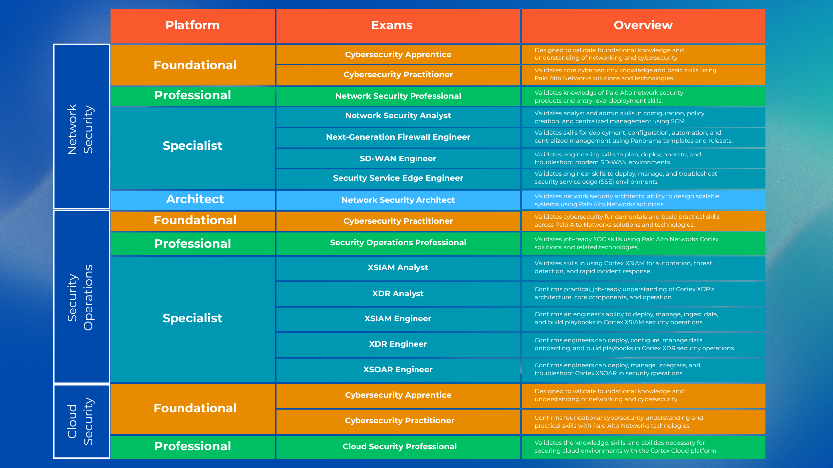 Our courses include Palo Alto Networks certifications in Cloud Security (PCCSE), Cybersecurity Fundamentals (PCCET), Network Security (PCNSE), and Security Operations (PCDRA and PCSAE).